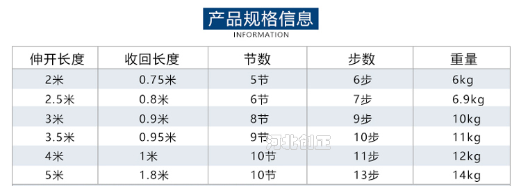 伸態2.5m, 縮態0.80m, 6節, 7步;
